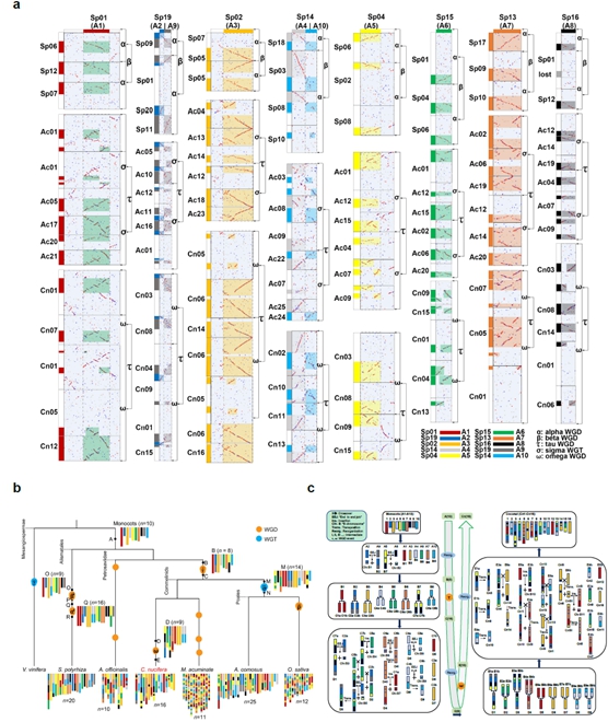 c从单子叶原染色体重建进化轨迹,形成现存的椰子染色体。