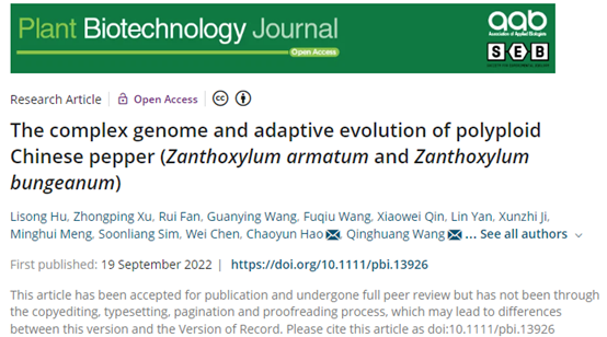 2022年9月19日,国际学术期刊Plant Biotechnology Journal在线发表了中国热带农业科学院香料饮料研究所联合华中农业大学、江苏金椒鸿香料科技研究院等7家单位完成的题为“The complex genome and adaptive evolution of polyploid Chinese pepper (Zanthoxylum armatum and Zanthoxylum bungeanum)”的研究论文。该研究组装了我国广泛栽培的四倍体竹叶花椒和红花椒的染色体级别基因组,揭示了复杂基因组进化、繁殖策略和适应性表型创新的遗传基础。